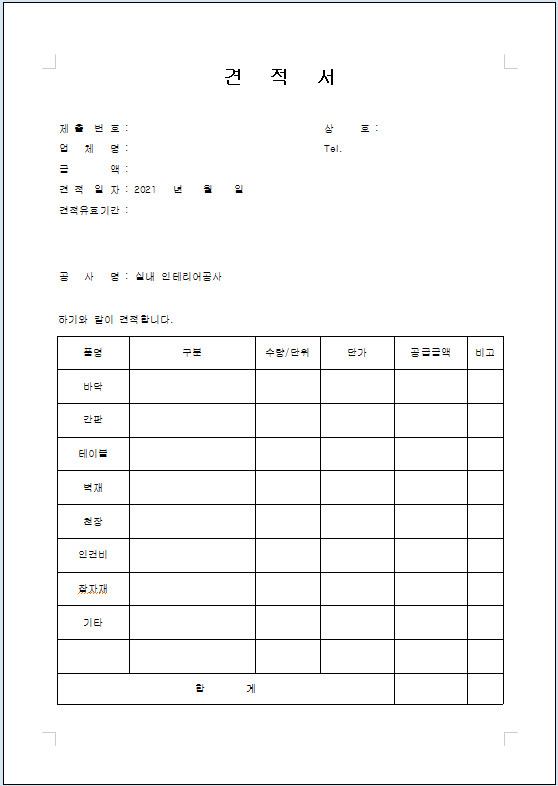 기재한 양식으로, 실내인테리어견적서를 작성할 때에는 업체명, 금액, 견적 일자, 견적 유효기한,