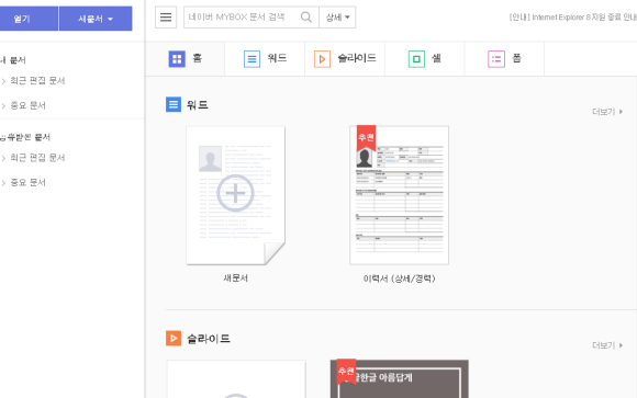 위 사진은 네이버 오피스 초기화면입니다.