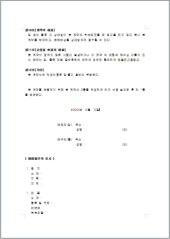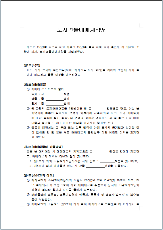 방식으로 토지건물매매계약서를 작성할 수 있으며 금액의 기초는 주변의 시세나 실측 면적을 기준으로 정함을 계약서에 명시해야 합니다.
