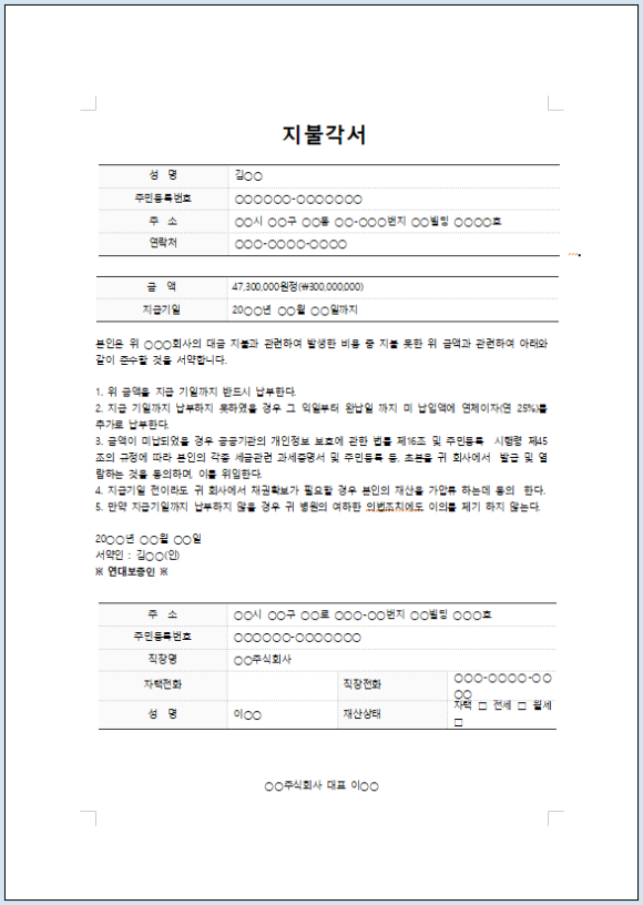 또한 지불 금액과 지불 기한을 명확히 설정하여 기록해야 하며 각서는