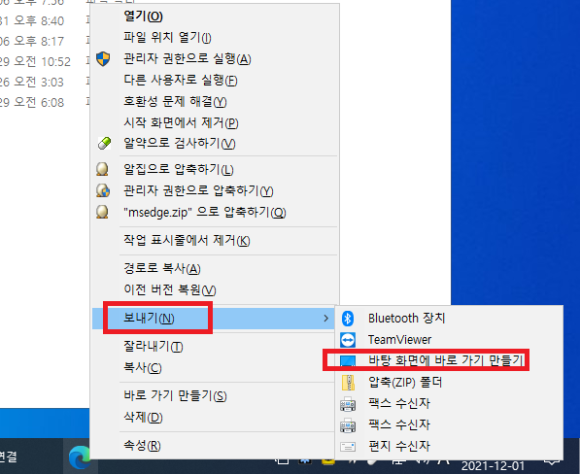 메뉴가 뜨면 보내기 -> 바탕화면에 바로가기 만들기를 클릭하면