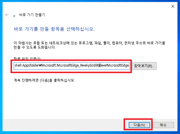 바로 가기 만들기 창이 뜨면 항목 위치에 다음 경로를 붙여넣고 다음을