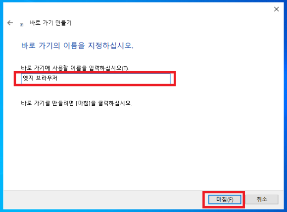바로가기의 이름을 원하는 대로 입력한 후 마침을 클릭합니다.