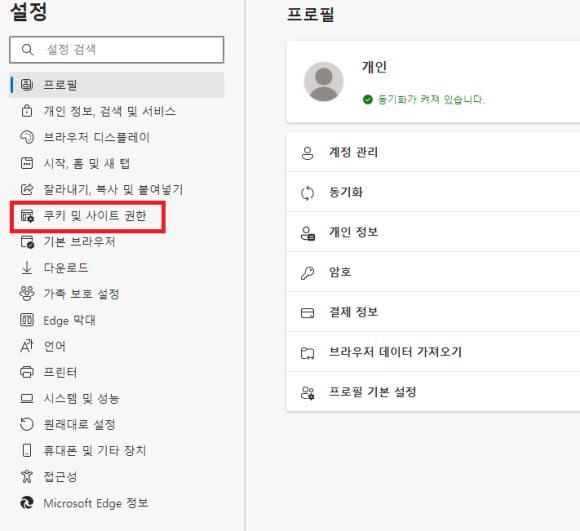 설정창이 열리면 오른쪽 메뉴중에서 '쿠키 및 사이트 권한'을 클릭합니다.