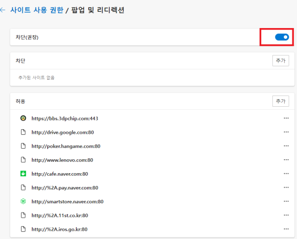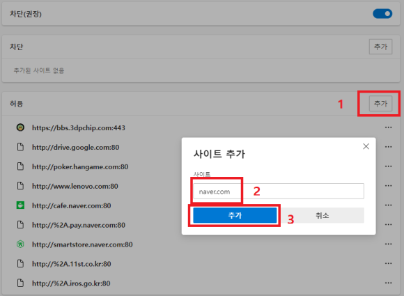 팝업 차단 메뉴는 켜둔 상태에서 허용 탭의 '추가'를 클릭하신후