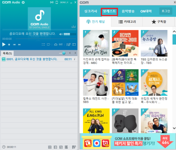 왼쪽창의 팟캐스트를 실행시키면 라디오방송등을 들을 수 있으며