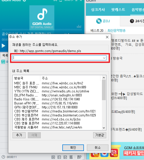주소 추가창이 뜨면 원하는 주소를 입력한 후 확인을 클릭하면 해당 방송이