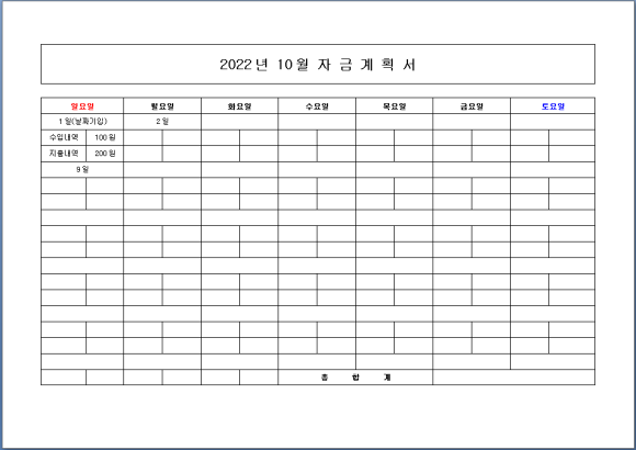 자금 계획서는 자금의 수입, 자금의 지출 등의 항목들로 구성이 되어 있습니다.