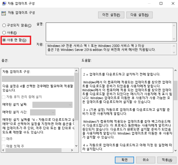 윈도우 업데이트를 막으려면 이 값을 사용안함으로 변경하면됩니다.