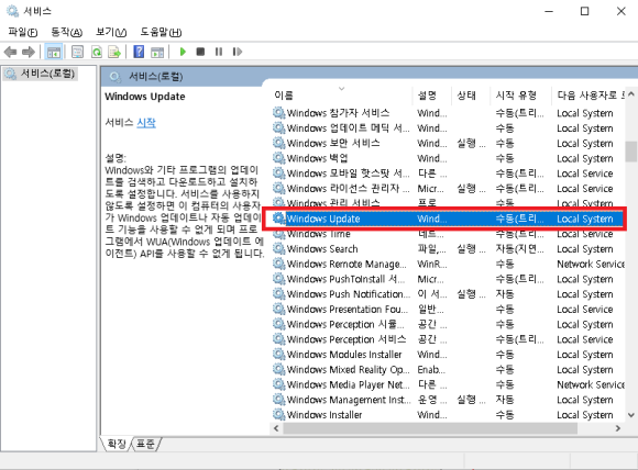 Windows Update의 시작유형은 기본값이 "수동"으로 되어있습니다.