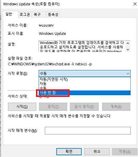 여기에서 유형을 "사용안함" 으로 변경하면 윈도우 업데이트가 되지 않습니다.