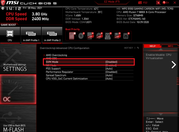 MIT > Advanced CPU Settings > SVM Mode 를 Enable로 변경하면됩니다 .