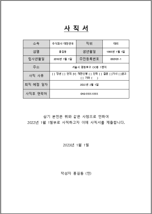 사직서란 퇴직을 희망하는 근로자가 사직하겠다는 사유를 분명히 하여 문서로 작성하는 양식을 말합니다. 사직서 양식은 정해진 기본 틀은 없지만 해당 회사에 따른 표준양식이 있는지 확인 후