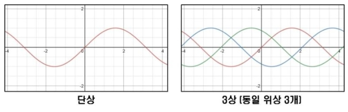 단상은 위 그림과 같이1개의 파형(상)으로 이루어진 교류 전원입니다.