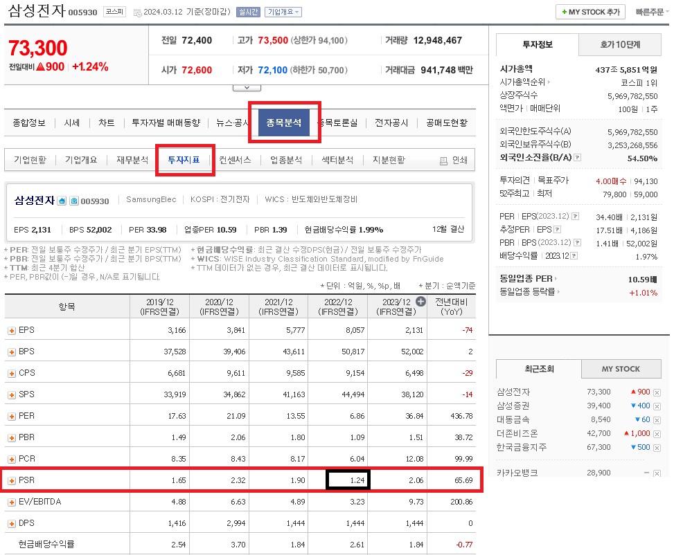 아래 사진과 같이 "종목분석" -> "투자지표" 를 순서대로 클릭하시면 화면하단의 PSR 값을 확인할 수 있습니다.