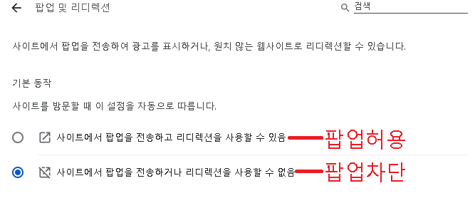 아래 사진과 같이 팝업 및 리디렉션 창에서 "기본 동작"의 라디오 버튼을 선택해