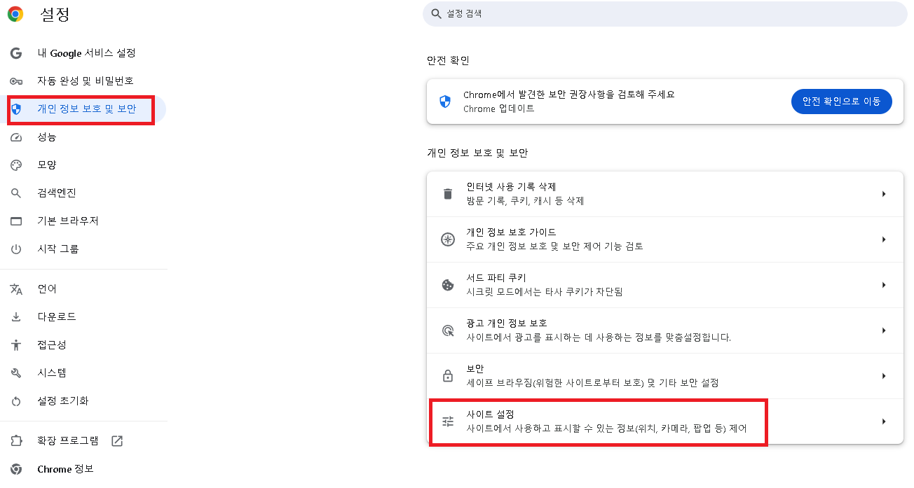 설정창이 열리면 아래와 같이 "개인 정보 보호 및 보안" - > "사이트 설정" 을 순서대로 클릭합니다.
