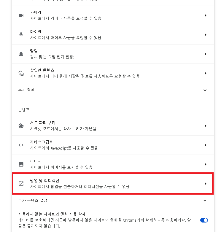 그다음 아래와 같이 화면 하단쯤의 "팝업 및 리디렉션"을 클릭합니다.
