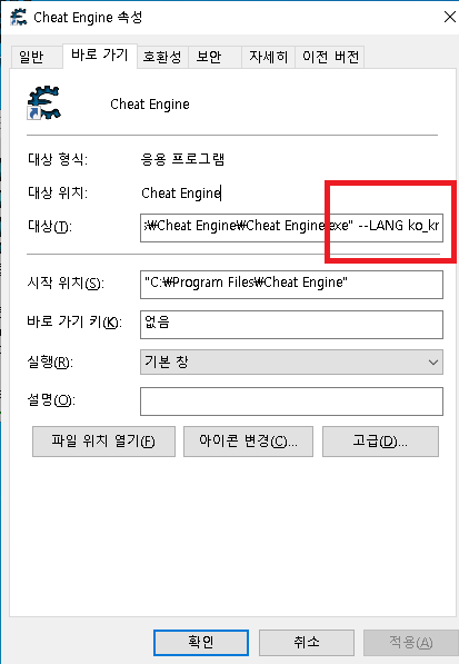 그 다음 바탕화면의 치트엔진 아이콘을 오른쪽 클릭해 속성을 클릭하고