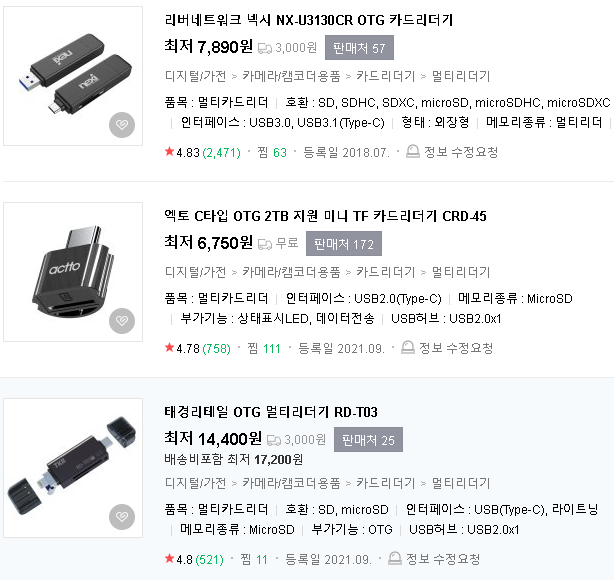 OTG리더기는 인터넷 쇼핑몰에 "OTG리더기"로 검색하면 몇천원대로 구매할 수 있습니다.