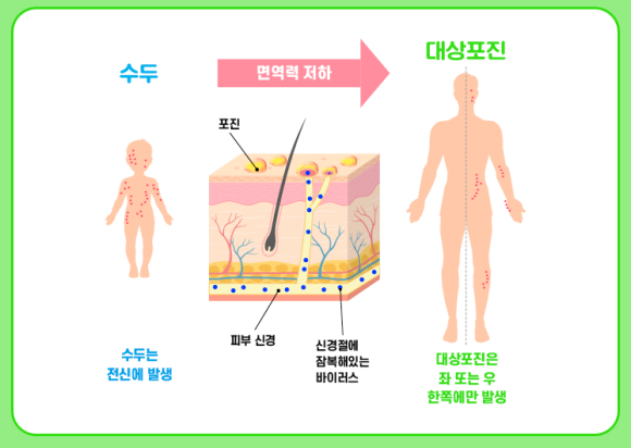 대상포진은 수두-대상포진 바이러스(varicella-zoster virus, VZV)에 의해 발생하는 질병입니다. 이 바이러스는 어린 시절에 수두를 일으킨 후, 신경세포에 잠복해 있다가 면역력이 약해지면 다시 활성화되어 대상포진을 유발합니다. 주로 성인에게 발생하며, 특히 면역력이 저하된 노인에게서 많이 나타납니다.