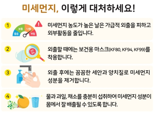 미세먼지에 효과적으로 대처하기 위해서는 몇 가지 방법이 있습니다. 아래의 이미지를 참고하여 실천해 보세요.