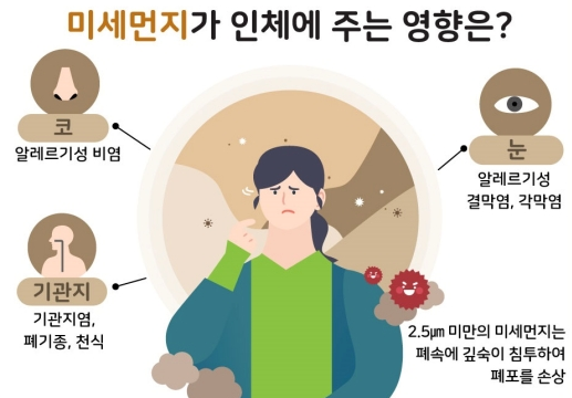 미세먼지는 호흡기 질환, 알레르기, 심혈관 질환 등 다양한 건강 문제를 유발할 수 있습니다. 특히, 어린이와 노인, 그리고 호흡기 질환이 있는 분들은 더욱 주의해야 합니다. 미세먼지가 코, 눈, 폐에 미치는 영향을 아래의 이미지로 확인해 보세요.