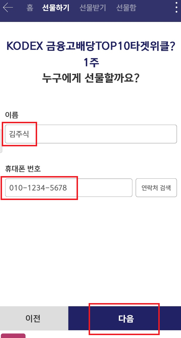 마지막으로 선물을 받을 사람의 이름과 휴대폰번호를 입력후