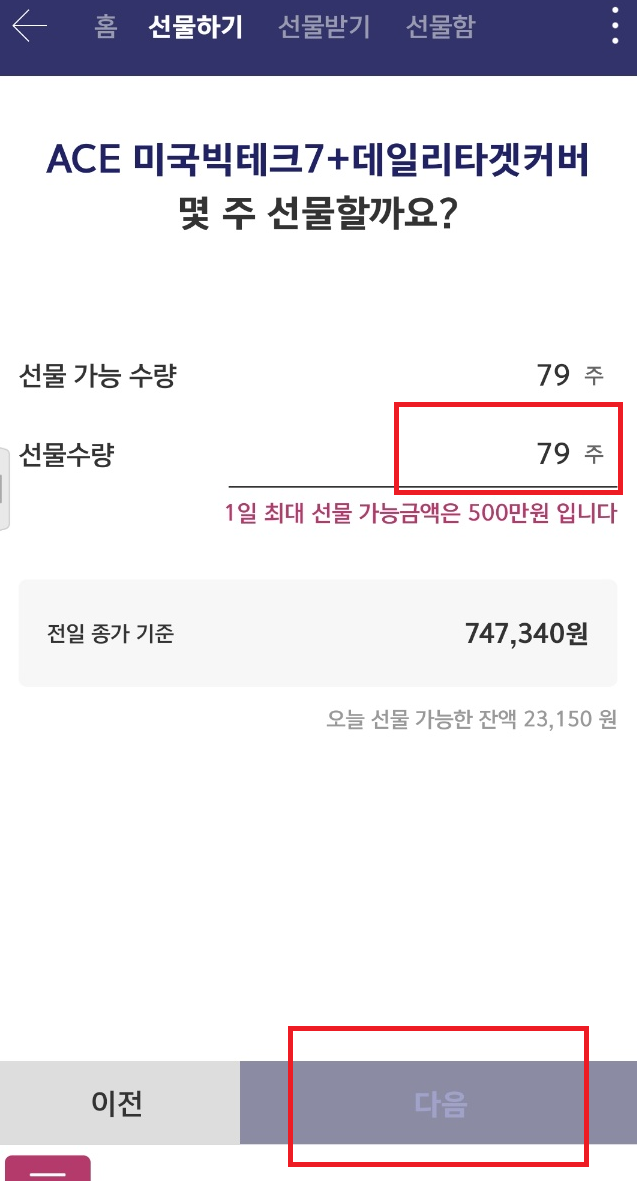 그 다음 선물할 주식의 수량을 1회 한도인 100만원 한도내에서