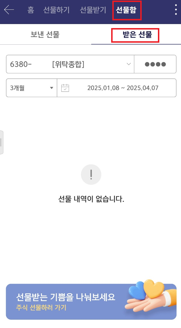 선물 내역을 확인하고 주식 선물하기 화면에서 ‘선물받기’를 선택한 뒤