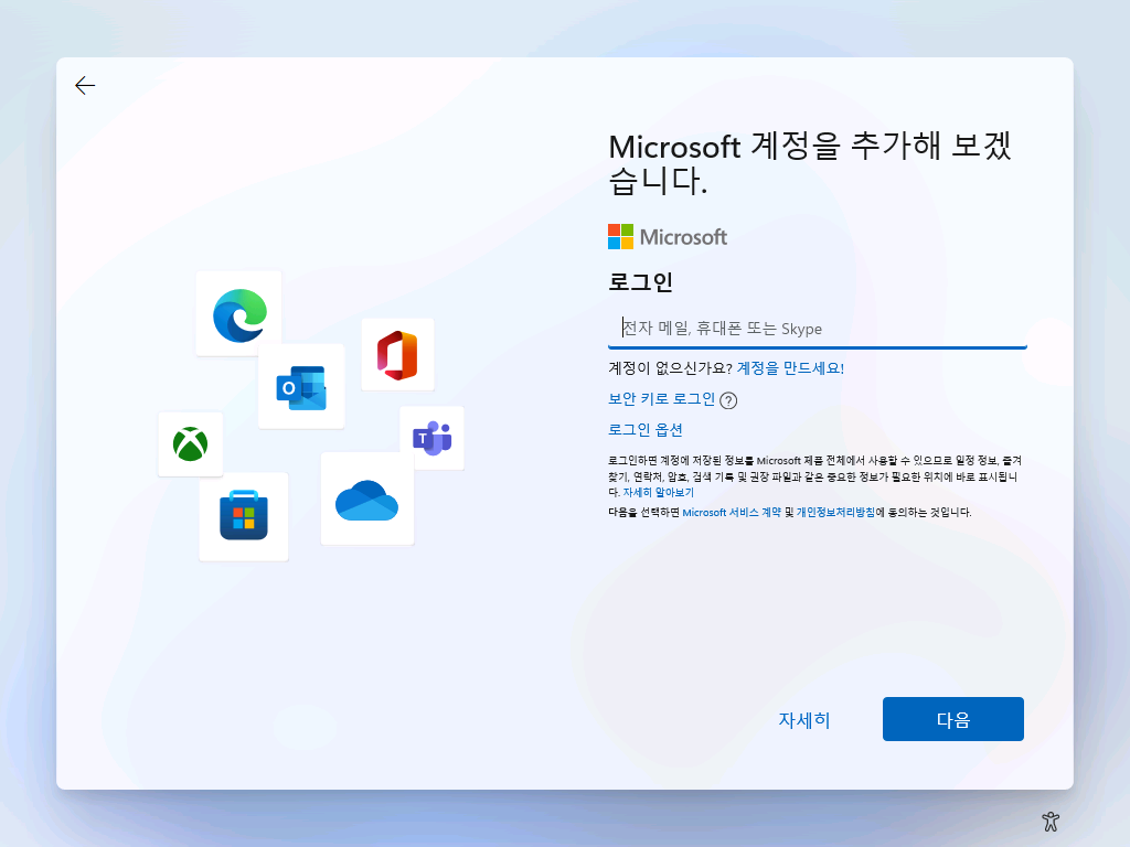 윈도우 11을 설치할 때 아래 사진과 같이 Microsoft 계정으로