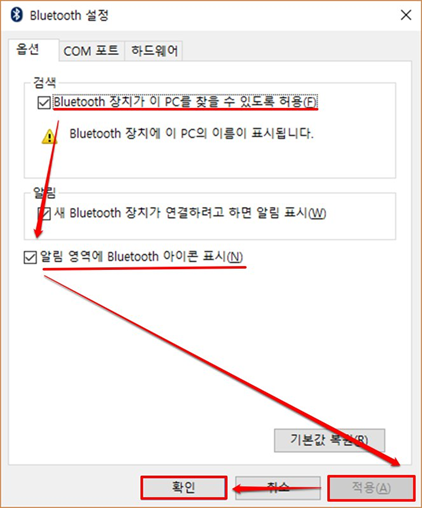 ※작업표시줄 알림 영역에 블루투스 아이콘이 없는 경우 : "알림영역에 Bluetooth 아이콘 표시(N)" 에 체크