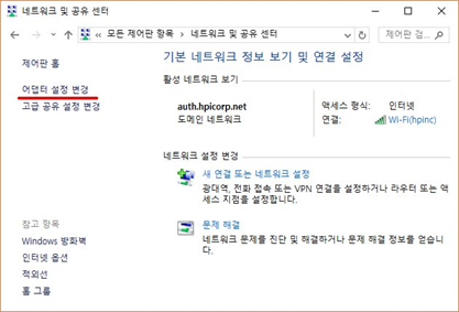 4. 창 왼쪽 상단 부분에 [어댑터 설정 변경]항목을 선택합니다.