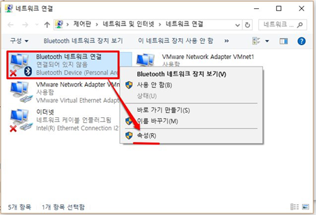 5. [Bluetooth 네트워크 연결]항목에서 마우스 오른쪽 버튼을 선택하고, [속성] 메뉴를 선택합니다.