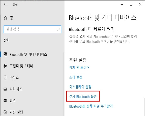 3. 블루투스 아이콘을 작업표시줄 알림 영역에 표시를 하려면 하단에 "추가 Bluetooth 옵션" 클릭하세요.