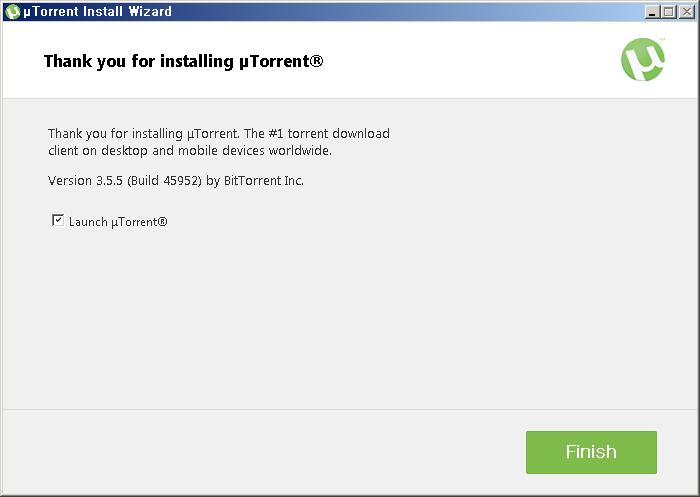 설치가 끝났습니다 Launch uTorrent에 체클를 하고 FINISH를 누르면 프로그램이 실행됩니다