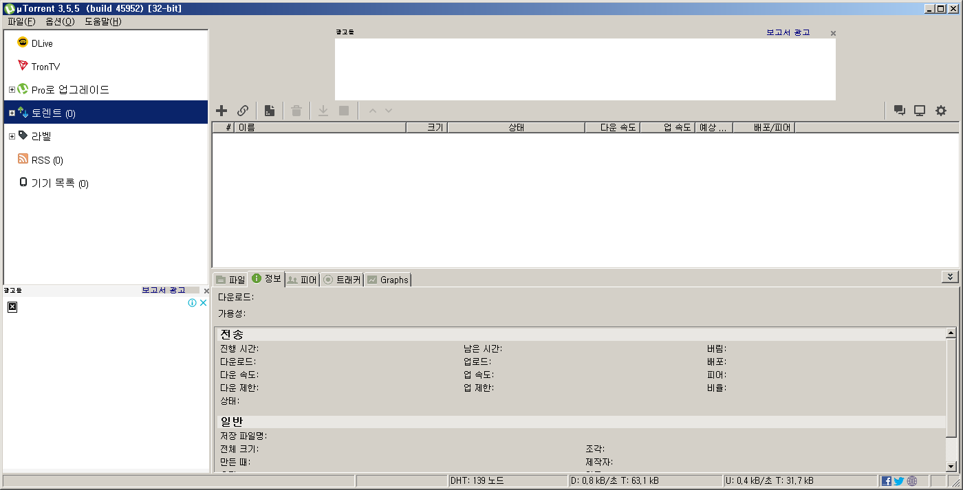 토렌트 프로그램이 실행된 화면입니다.
