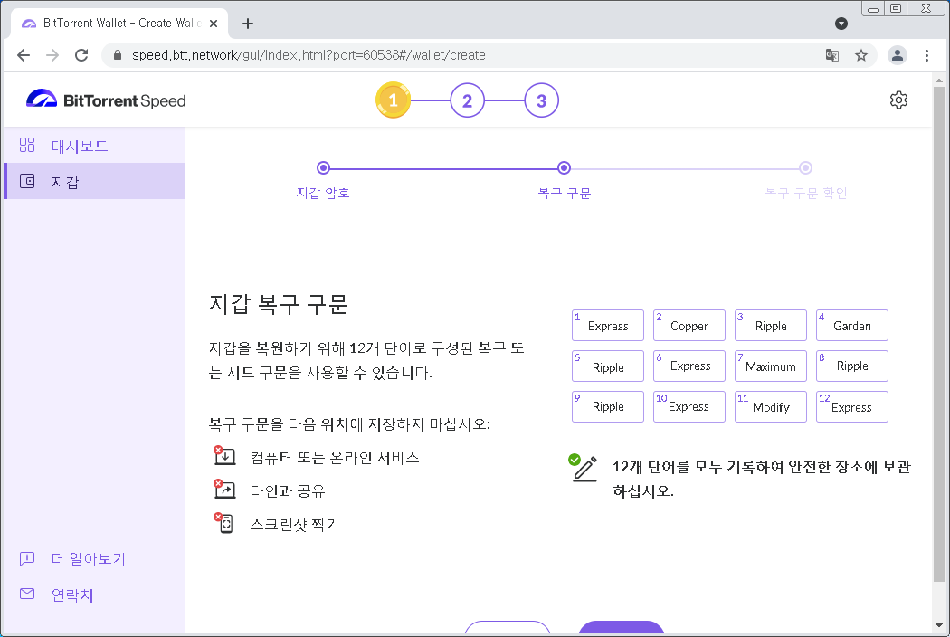 컴퓨터를 포맷하거나 비밀번호를 잃어버리거나 하는 경우 위의 12개 단어로 지갑을 복구하실수 있습니다