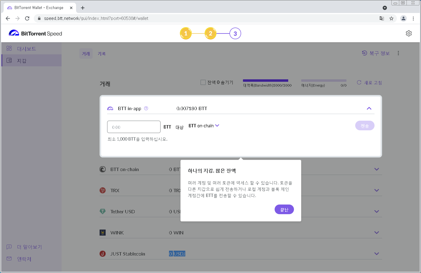적립된 BTT는 1000BTT 단위로 이체할 수 있습니다