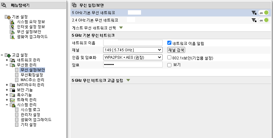 트리 메뉴의 고급설정 -> 무선랜 관리 - > 무선 설정/보안 순으로 클릭하면