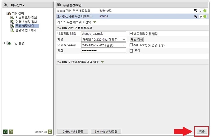 *'5GHz 기본 무선 네트워크' 설정이 있는 듀얼밴드 공유기라면 '5GHz 기본 무선 네트워크'를 선택 후