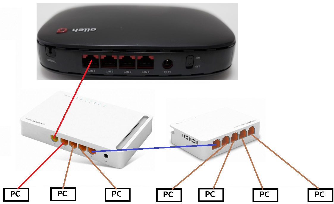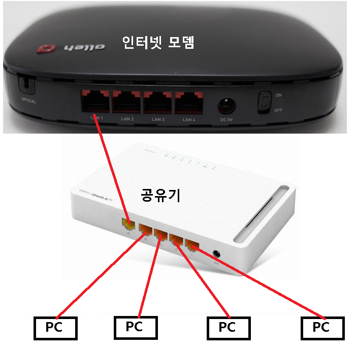 대부분의 인터넷 공유기는 4포트를 내장하고 있는데, 4대 이상의 PC가 하나의 인터넷 IP를 공유하기 위해서는