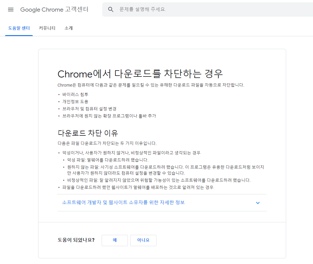 크롬브라우저를 사용하다보면 위 사진과 같이 해당 파일이 위험하므로 크롬에서 차단되었다는 메세지가