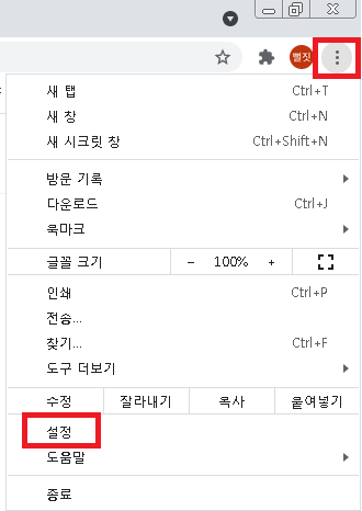 크롬 브라우저 제일 오른쪽 상단의 설정 메뉴를 클릭합니다.