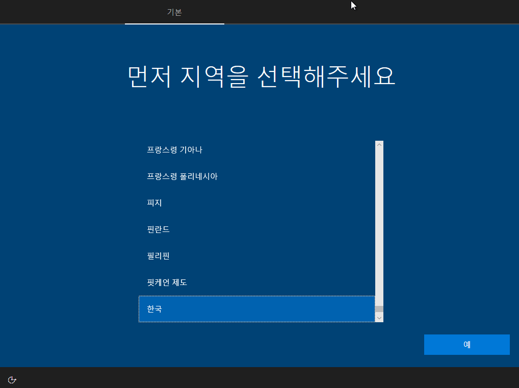 재부팅이 완료되면 윈도우를 설치한 직후와 같이 기본적인 설정을 묻는 화면이 나옵니다.