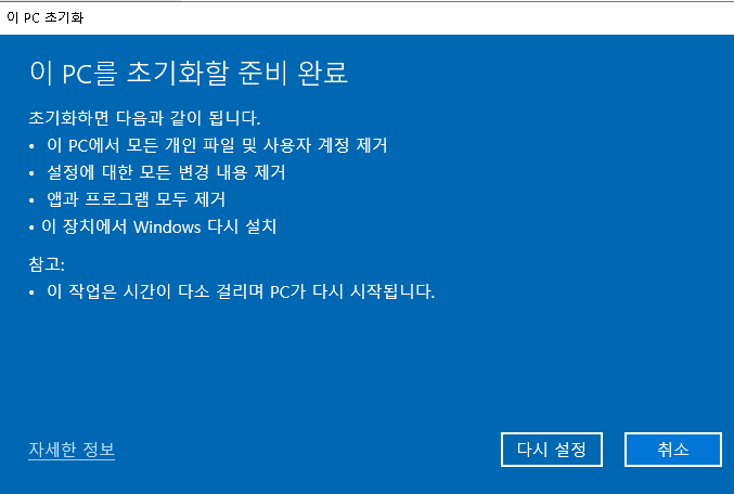 준비 완료 메세지가 뜨고 여기서 '다시 설정'을 클릭하시면 윈도우가 재부팅되면서 초기화됩니다.