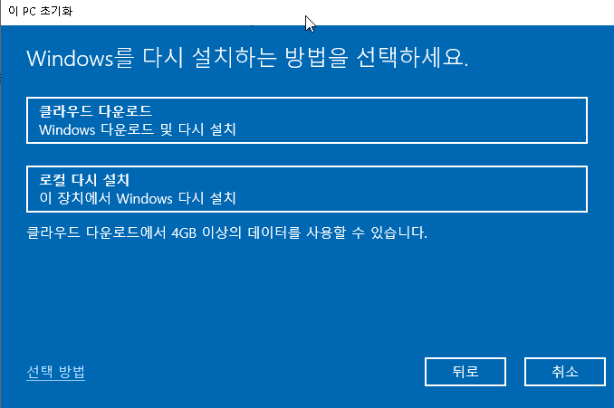 모든 항목 제거를 선택하셨을 경우는 아래 사진과 같이 다시 설치하는 방법을 선택하는 화면이 나옵니다.