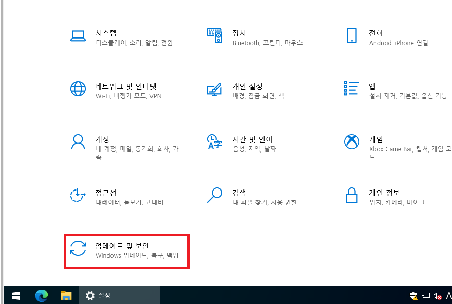 윈도우 설정창이 뜨면 '업데이트 및 보안' 메뉴를 클릭합니다.