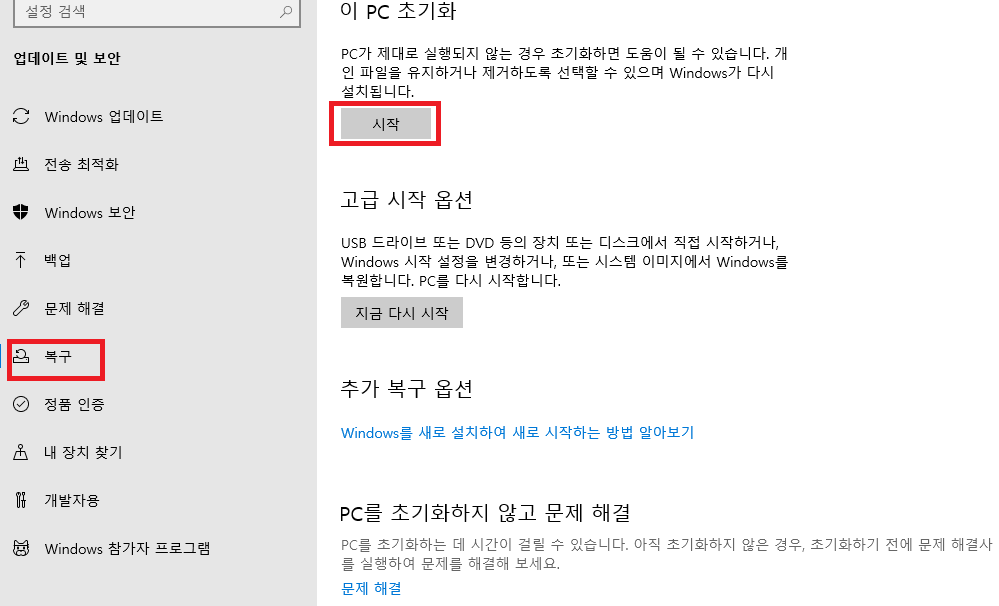왼쪽 메뉴에서 '복구'를 클릭하신후 이 PC초기화 밑에 있는 '시작'버튼을 클릭합니다.