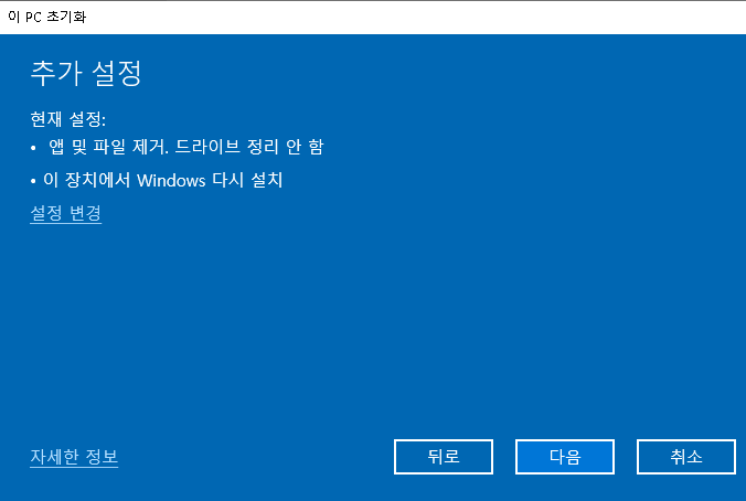 이 설정들을 마치고 나면 윈도우초기화 과정이 끝납니다.